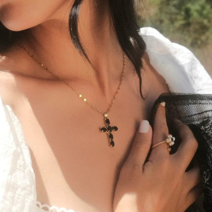 The Onix Cross Necklace is not just jewellery. It’s a statement. Its deep black stones contrasted with a radiant gold chain create a powerful, sophisticated look that captures attention instantly.